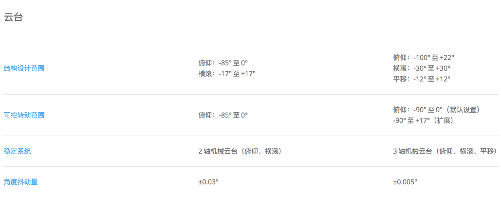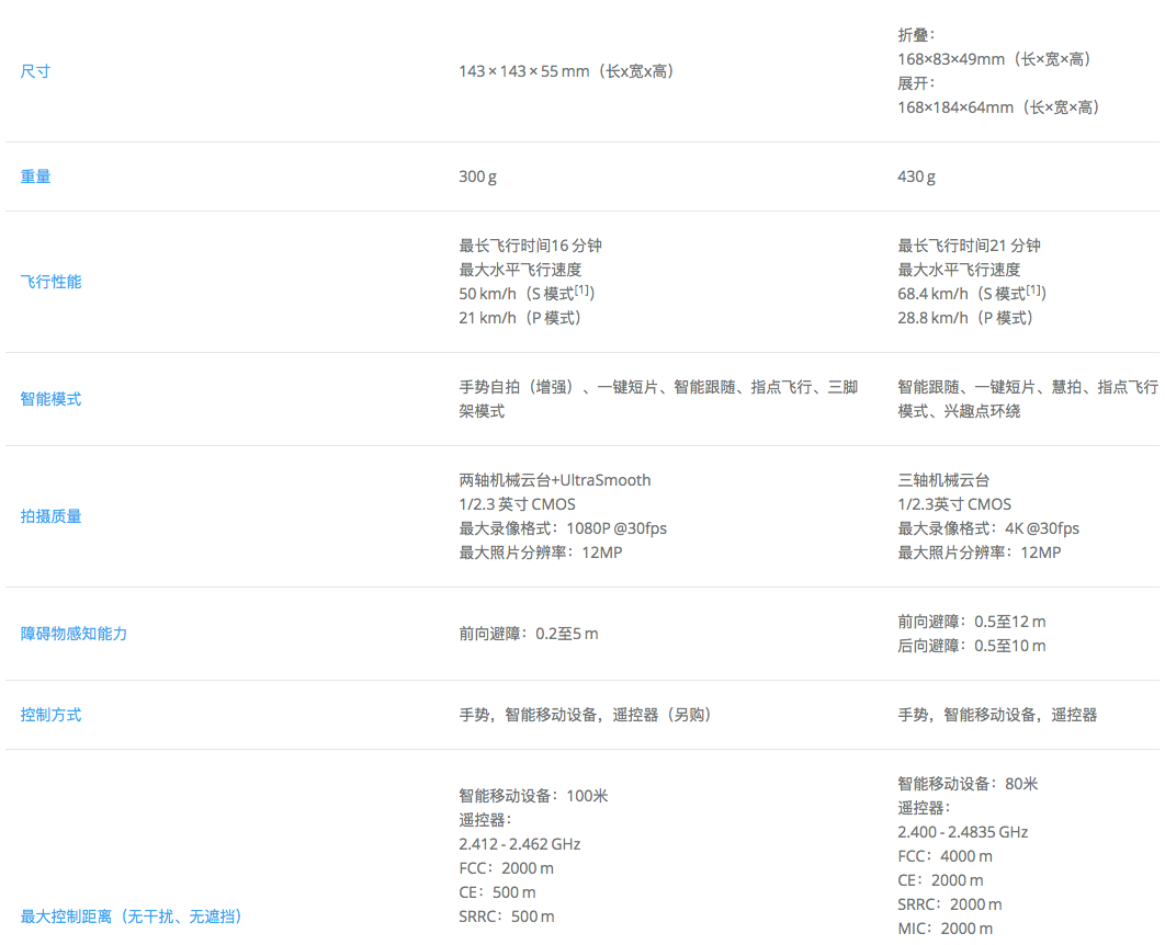 在规格上,飞行器的轴距因为体积的缩小从 330mm 变成了 213mm,重量上比 Spark(大疆目前最轻机型 300 g)增加了 130 g,电池变成了 27.43Wh,官方提供的续航参考也只有 21 分钟。我们来看详细的对比参数(左侧都为 Spark):